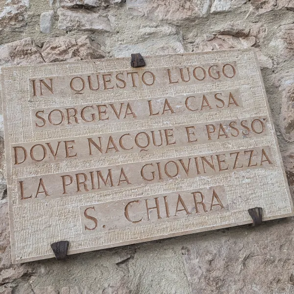 På dette sted lå huset, hvor Sankt Clara blev født og tilbragte sin første ungdom.Sådan fortæller skiltet på muren. Stedet ligger lige ved den store katedral San Rufino i Assisi. Og det er faktisk første gang, jeg ser det – selvom jeg har været her før. Sidst jeg var i....