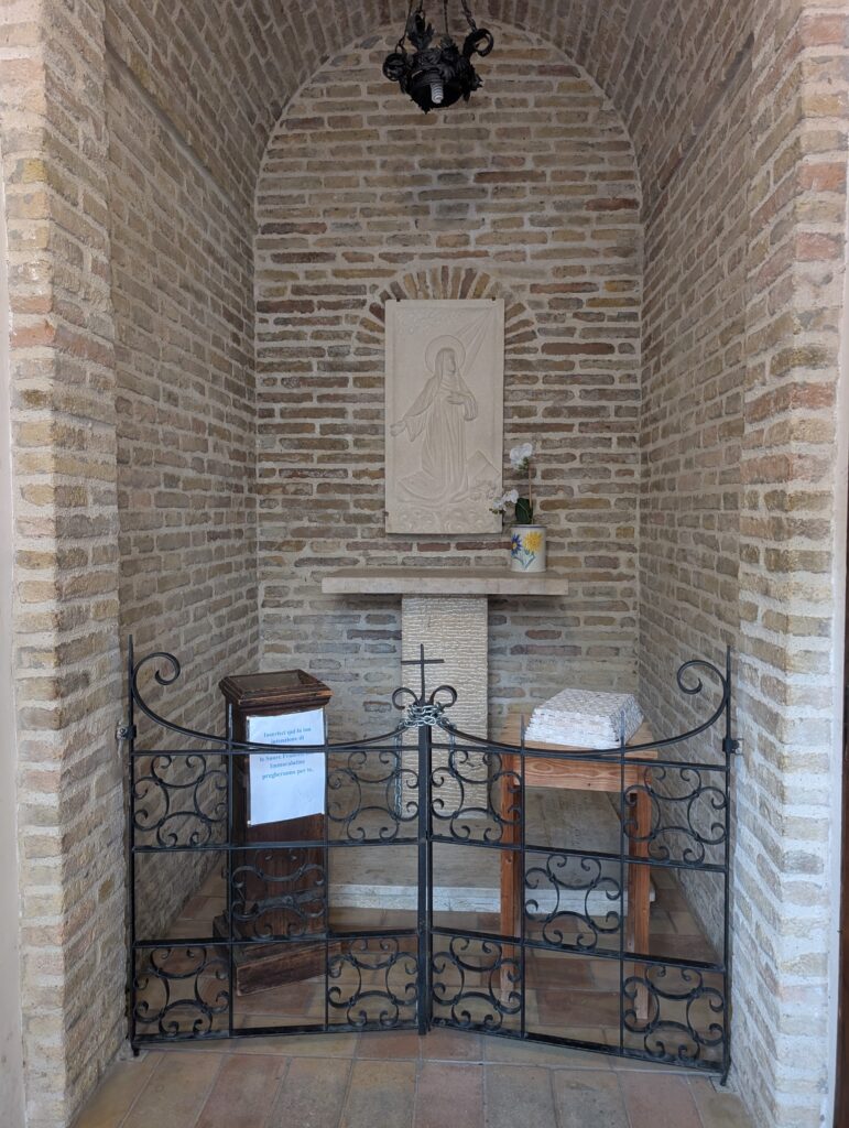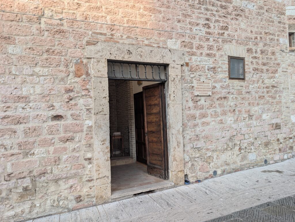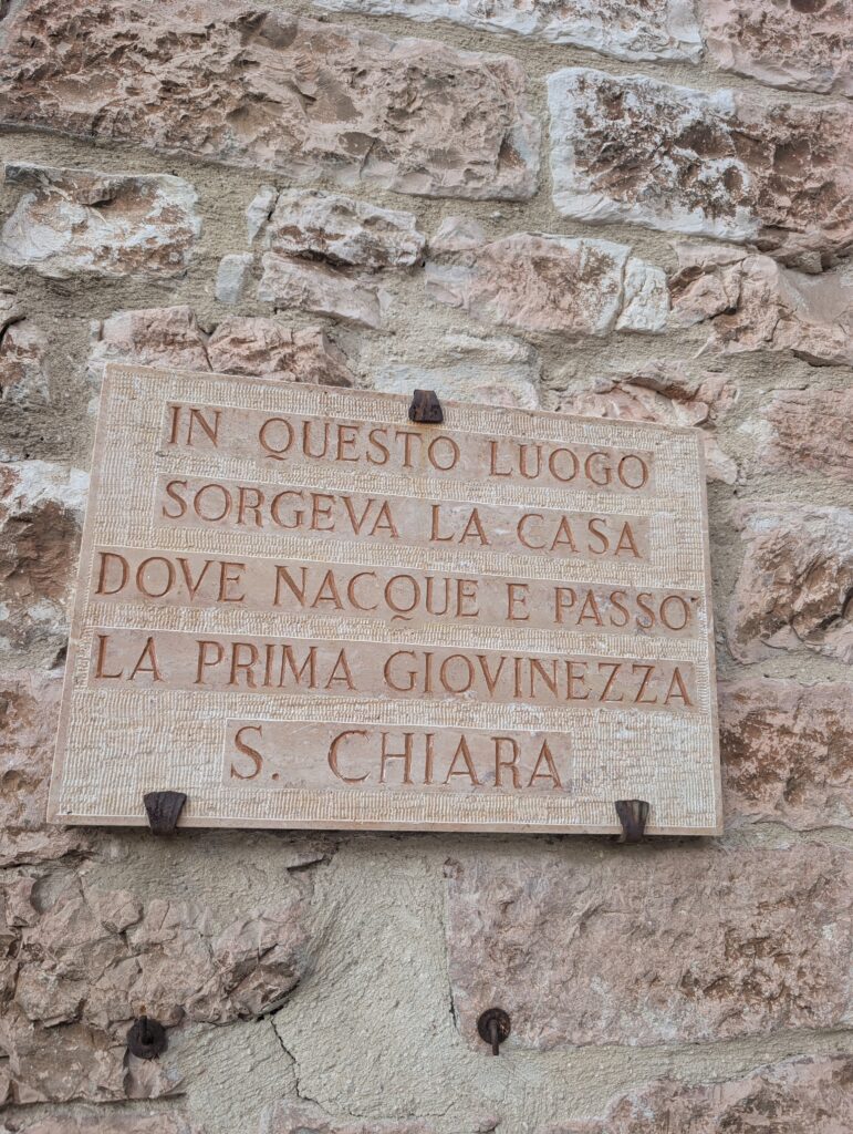 Stedet ligger lige ved den store katedral San Rufino. Og det er første gang at jeg ser det, selvom jeg har været her før. -Faktisk ledte jeg efter det sidst jeg var i Assisi, fordi jeg tænkte at der jo måtte være en markering af Claras fødested, ligesom der er med Frans. Men jeg fandt det ikke… Og for at gøre historien lidt sjovere, så boede jeg ca ét minut væk i gåafstand sidst jeg var her